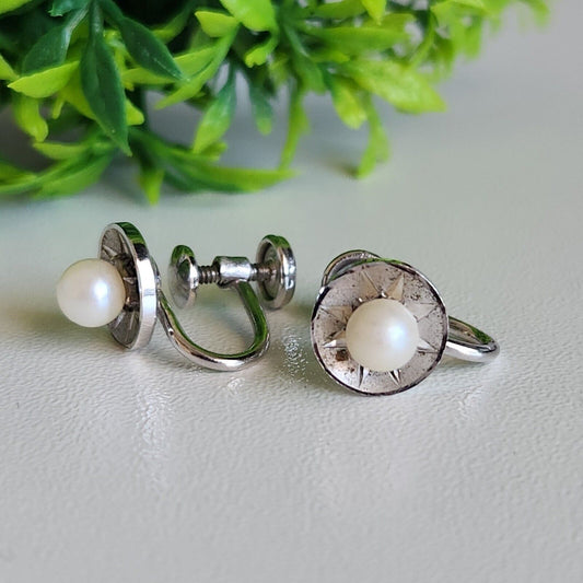 925 Sterling Silver Marvel 1940s Screw Back Pearl Earrings